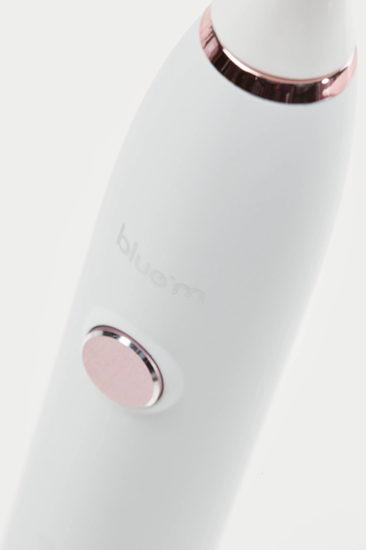 Unlike the manual toothbrush, you allow the Sonic+ toothbrush to do the work for you for a slightly longer brushing time than usual. Place the brush head in a 45 degree angle and move the brush slowly, using minimal pressure, from tooth to tooth. Go back and forth for the longer bristles to reach between your teeth. Work from quadrant to quadrant, the timer will remind you to switch to each of the 4 sections in your mouth. Use the massage mode after cleaning and extend your oral care ritual with an extra minute. To effectively clean your teeth, use blue®m toothpaste. It is relatively liquid and makes your toothbrush more effective in removing plaque. Replace the toothbrush head of your Sonic+ toothbrush every 3 to 4 months.